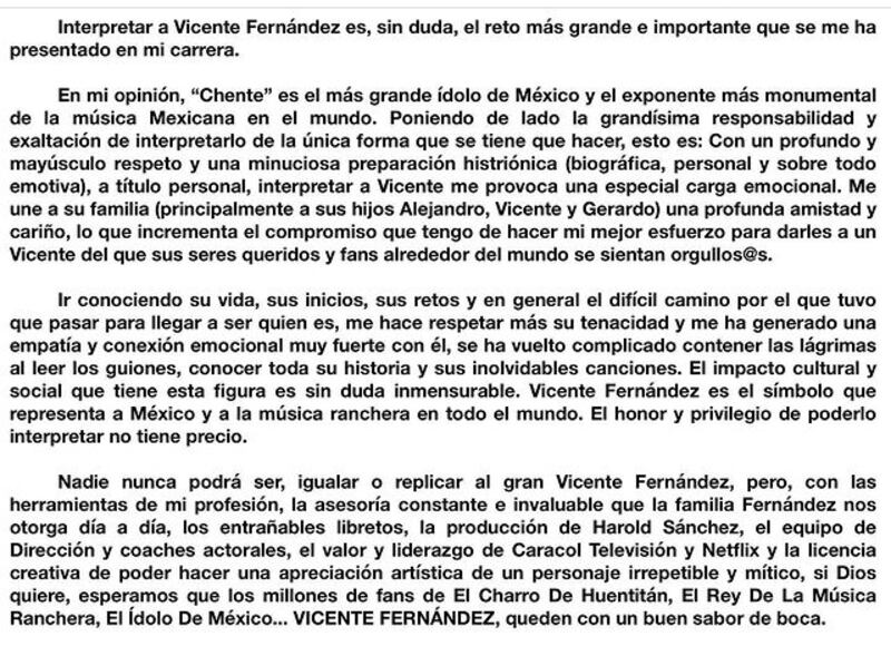 "Nadie nunca podrá ser, igualar o replicar al gran Vicente Fernández, pero, con las herramientas de mi profesión, la asesoría constante e invaluable que la familia Fernández nos otorga día a día, los entrañables libretos, la producción de Harold Sánchez, el equipo de Dirección y coaches actorales esperamos que los millones de fans El Rey De La Música Ranchera queden con un buen sabor de boca", destacó.