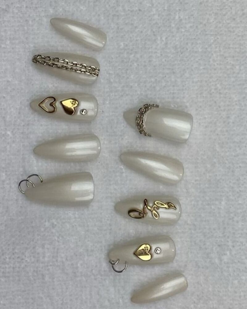 La esposa de Ben Affleck apostó por unas cadenas que lucieron a lo largo y ancho de algunas uñas, además de unos corazones dorados, uno perfilado y otros rellenos, los cuales serían un guiño al romance que mantiene con el actor y productor de Hollywood.