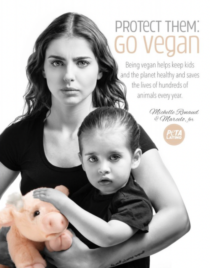 “Protégelos, hazlos veganos. Hacerlos veganos mantiene a los niños y al planeta sanos y salva la vida de miles de animales”, se leía en la controvertida imagen en la que se ve a la actriz y a su hijo con un peluche de puerquito.