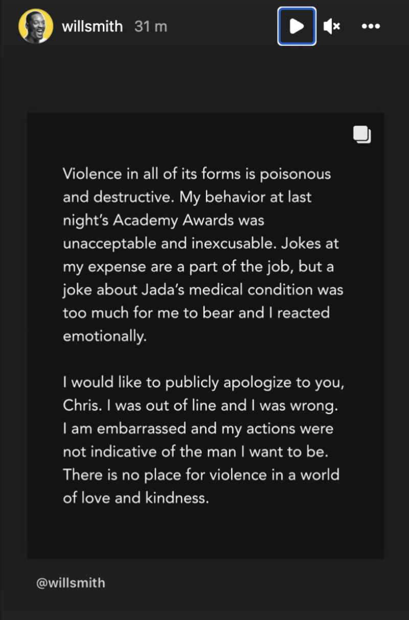 “La violencia en todas sus formas es venenosa y destructiva. Mi comportamiento anoche en los premios de La Academia fue inaceptable e inexcusable. Las bromas a costa mía son parte del trabajo, pero una broma sobre la condición médica de Jada fue demasiado para mí y reaccioné emocionalmente”, comenzó su escrito.