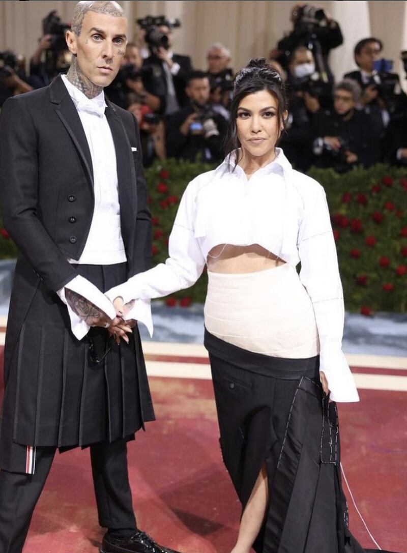 Kourtney llegó de la mano de su prometido, Travis Barker. La pareja portó atuendo coordinados en color negro, blanco y gris de Thom Browne. Como ya es casi una tradición para los enamorados, mostraron cuanto amor se tienen y sellaron su paso por la alfombra rojo con un beso.