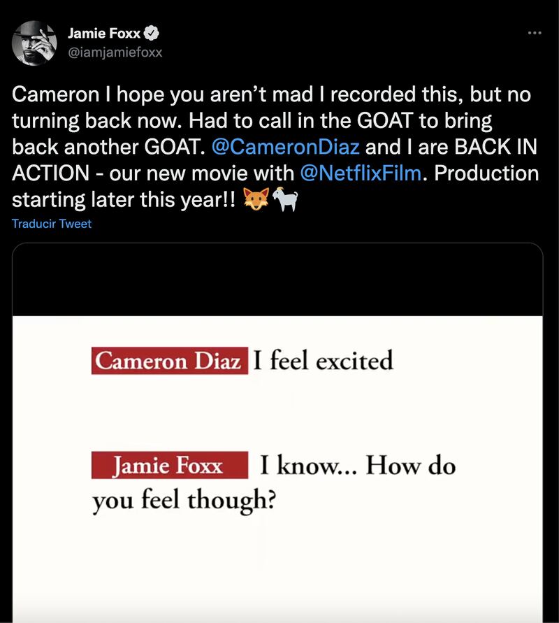 Fue el propio Jamie Foxx, quien anunció la noticia en su cuenta de Twitter: "Cameron, espero que no estés enojada porque grabé esto, pero no hay vuelta atrás ahora. Tuve que llamar a la GOAT (la mejor de todos los tiempos) para traer otro GOAT. @CameronDiaz y yo VOLVEMOS A LA ACCIÓN, nuestra nueva película con @NetflixFilm. ¡La producción comenzará a finales de este año!".