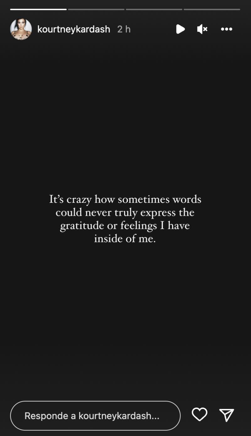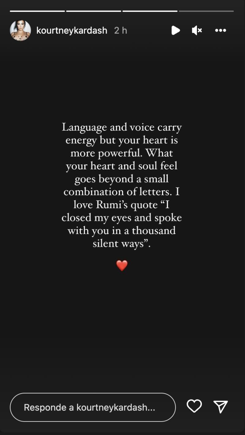 Además Kourtney compartió un pensamiento que expresa sus sentimientos: "El lenguaje y la voz llevan energía pero tu corazón es más poderoso. Lo que tu corazón y tu alma sienten va más allá de una pequeña combinación de letras. Me encanta la cita de Rumi "Cerré los ojos y hablé contigo de mil maneras silenciosas".