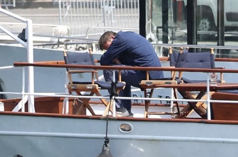 Durante el recorrido en bote, el actor fue captado en varias posiciones: subiendo los pies a un un barandal y recostado hacia atrás, haciéndose bolita abrazado de sus piernas, hasta que cayó en sueño profundo, mientras no había rastro ni de Jennifer Lopez ni de sus hijos.
