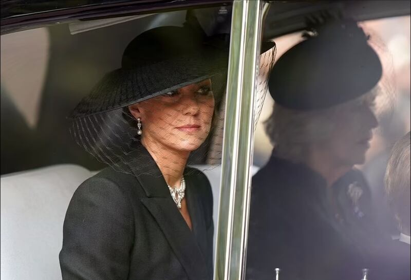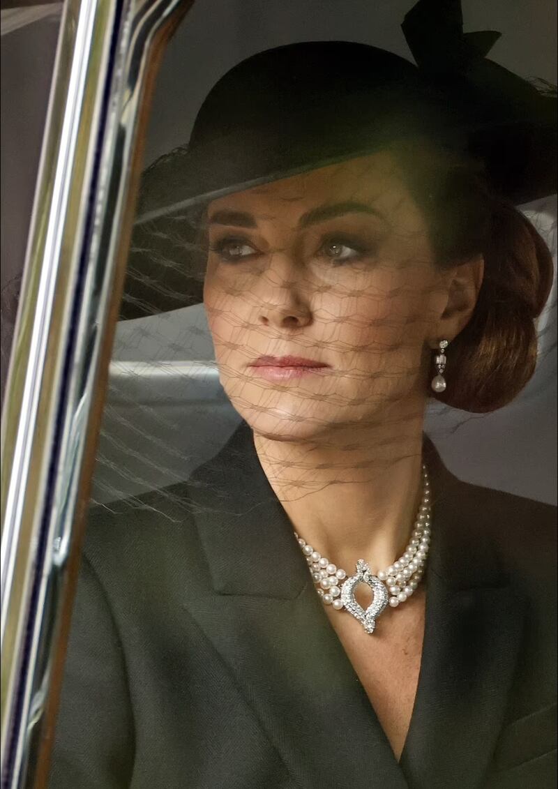 La princesa de Gales llegó a la Abadía en automóvil junto a la reina Camila. Kate nunca dejó de evidenciar una actitud seria, con la mirada firme, que ayudaban a darle protagonismo al collar de perlas que llevaba.