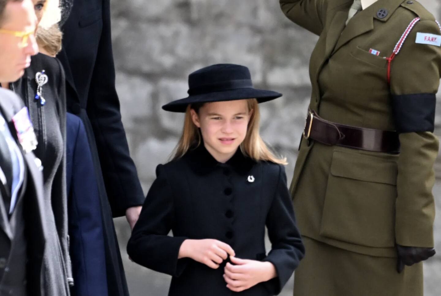 Para la ceremonia, la hija del príncipe William y Kate Middleton portó un sombrero con lazo de Jane Taylor, vestido negro, con un abrigo del mismo color y cuello de terciopelo, en el que resaltaba la joya con la que hizo un guiño a la fallecida monarca.