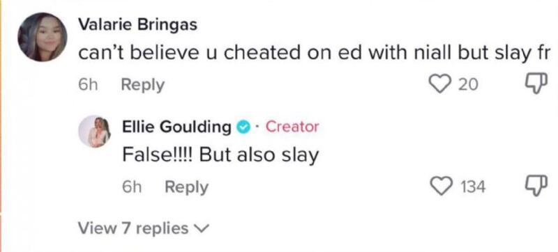 Esta vez la atención no estuvo enfocada en su contenido, sino en un directo comentario de una usuaria en uno de sus videos más recientes, en el que aparece bailando “As it was” de Harry Styles. "No puedo creer que engañaste a Ed con Niall, pero estás arrasando", comentó una seguidora de la cantante, a lo que Ellie respondió más tarde con un rotundo: “Falso”.