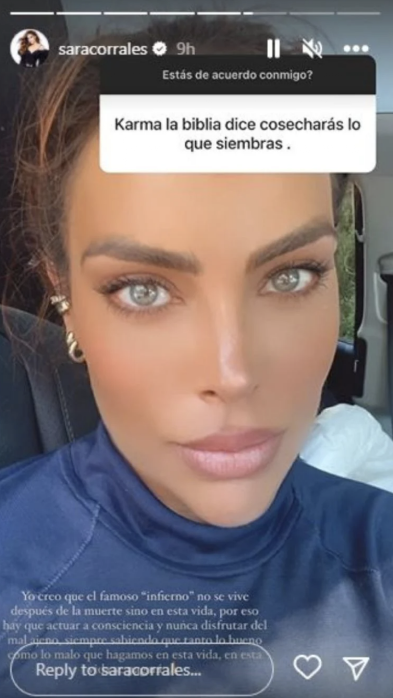 Y en medio de todos los rumores, Sara Corrales subió un mensaje que causó mucho revuelo entre sus seguidores ya que dio su propia definición de ‘karma’, como si se tratara de una indirecta.