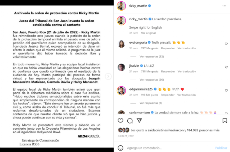 De momento Ricky Martin no ha hecho pronunciamiento alguno sobre el tema y en sus redes sociales sólo hay promocionales de sus conciertos. El cantante tiene tres hijos y está casado por el artista Jwan Yusef.