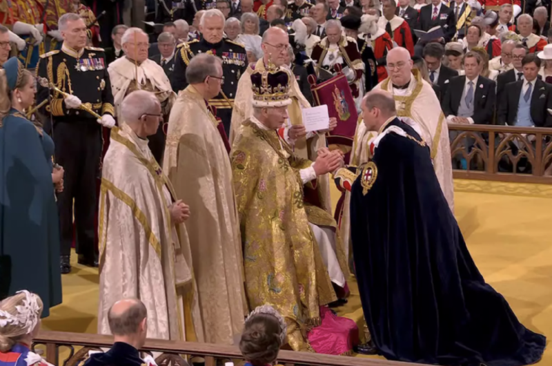 Tras la coronación, el esposo de Kate Middleton se arrodilló ante el rey Carlos y puso sus manos sobre las de su padre diciendo: "Yo, William, príncipe de Gales, te juro mi lealtad y la fe y la verdad que te profesaré, como tu señor de vida y muerte. Con la ayuda de Dios", para después tocar la corona de su padre y besar la mejilla del monarca.