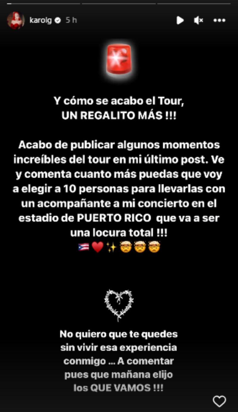 La cantante no solo enamoró a sus fans con sus palabras en la publicación, sino que también dejó entrever que tiene algo más preparado para ellos. Y es que, a través de sus historias de Instagram, Karol G comentó que tiene un concurso dedicado a sus fanáticos, el cual consiste en comentar muchas veces su último post y los ganadores, ya que serán 10, tendrán la oportunidad de asistir, con un acompañante, a su concierto en Puerto Rico.