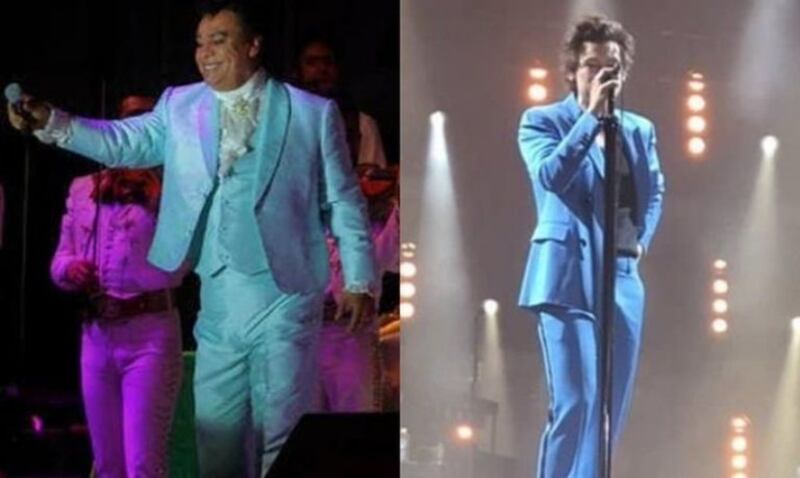Aunque no sabemos si exista una conexión entre el británico, de 28 años de edad, y Juan Gabriel, fallecido en 2016 a la edad de 66 años, lo cierto es que los fans han encontrado que los trajes de Styles son casi idénticos a los que utilizó el “Divo de Juárez”. Aquí te dejamos algunas de las comparaciones que han hecho usuarios en redes sociales.