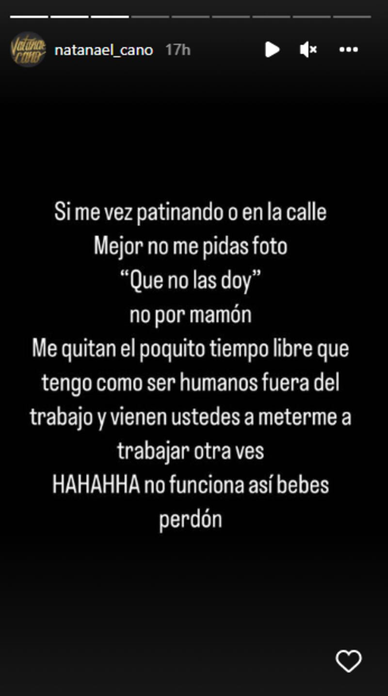 "Si me ves patinando o en la calle, mejor no me pidas foto que no las doy, no por mamón. Me quitan el poquito tiempo libre que tengo como ser humano fuera del trabajo y vienen ustedes a meterme a trabajar otra vez. Hahahaha no funciona así, bebés, perdón", escribió en sus historias de Instagram.