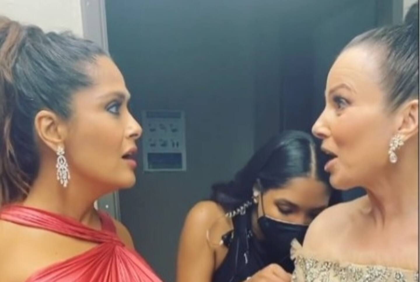 Aunque ambas se mostraban tranquilas, la asistente que trataba de desatorar el accesorio se veía ligeramente desesperada, incluso cuando logra separarlas mostró un gran alivio. En lo que esto sucedía, la actriz recordada por su papel en la serie La niñera, le mencionó a Salma lo mucho que admiraba su valentía y que reconocía su “magnífico trabajo en Gucci”. “Amo cada vez que nos vemos, incluyendo esa vez en París”, dijo.