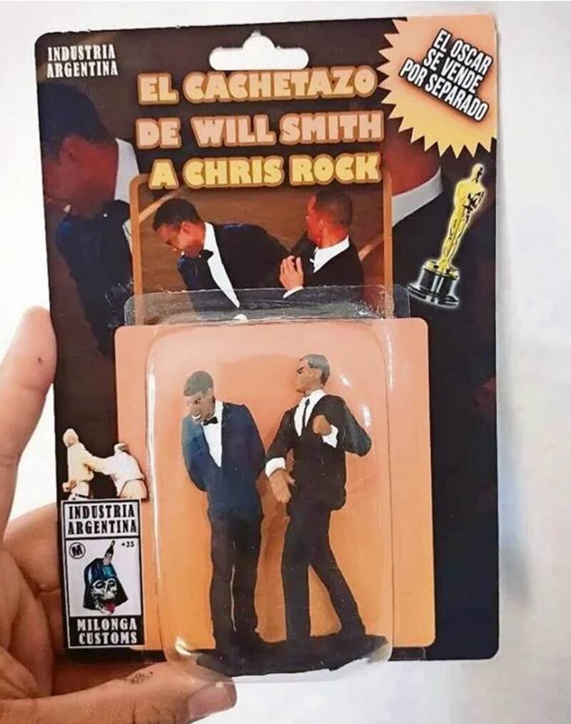 Por último, en Argentina, un grupo de artesanos aprovechó la situación para fabricar una figura de acción que plasma el golpe de Will a Chris. La escultura corrió por parte de Milonga Costums, quienes son un colectivo que se dedica a inmortalizar varios de los momentos y personajes más polémicos y virales de internet, tales como Residente, el perrito Cheems, Vladimir Putin y otros más.