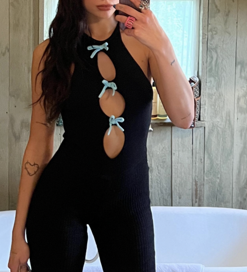 La intérprete de Break my Heart tituló su publicación como “Historias de la hora del baño”, en él posa junto a su amiga Sarah Lysander en un baño con tina, pero para decepción de muchos lo hace con un jumpsuit negro de corte capri que tiene unos detalles de tiernos moños en tono azul cielo, su look lo completó con uno estiletos de Cenicienta y su melena, que volvió al castaño, suelta.