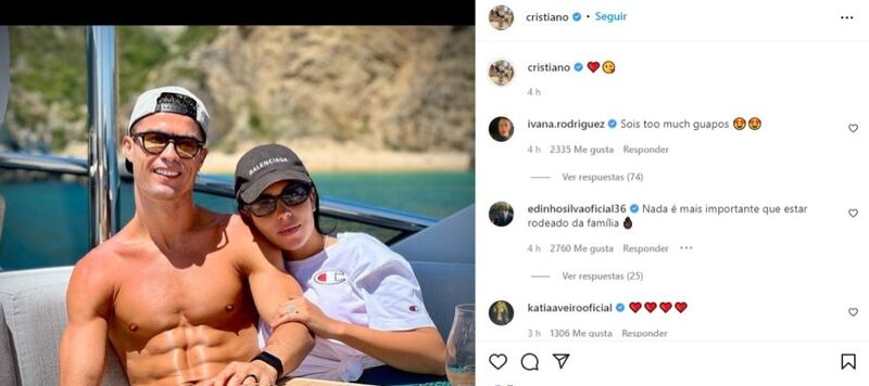 Al parecer se encuentran desayunando en un yate, en la mesa hay cubiertos, manteles, copas y pan, de fondo se alcanza a apreciar el mar; los hijos del futbolista no aparecen. En esta publicación solo agregó un emoji de corazón y una carita amarilla con un beso.