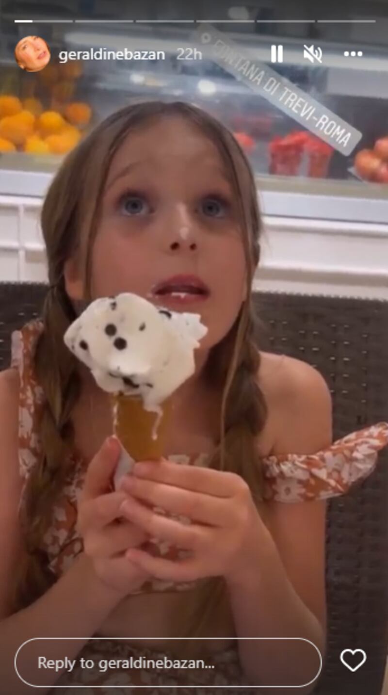 A través de sus historias de Instagram, Geraldine compartió una foto de Alexa, en la que se le ve disfrutar de un helado, mientras descansa en un establecimiento de postres, cerca de la fuente Fontana di Trevi, en Roma.