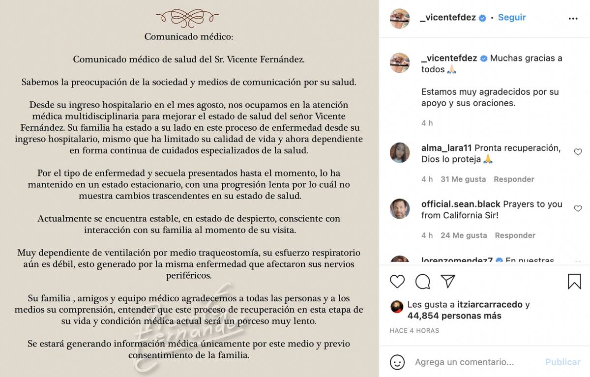 Este lunes a través de las redes sociales oficiales de Vicente Fernández se dio a conocer nuevamente el reporte médico sobre la salud del cantante.