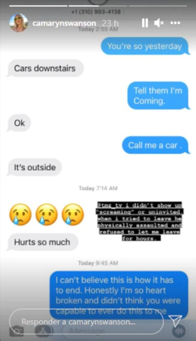 "No me aparecí gritando o sin invitación. Cuando intenté irme, él abusó físicamente de mí y se rehusó a dejarme ir por horas", aseguró la influencer. Además, añadió en sus historias de Instagram una captura de la conversación en la que parece que él fue quien buscó el encuentro.