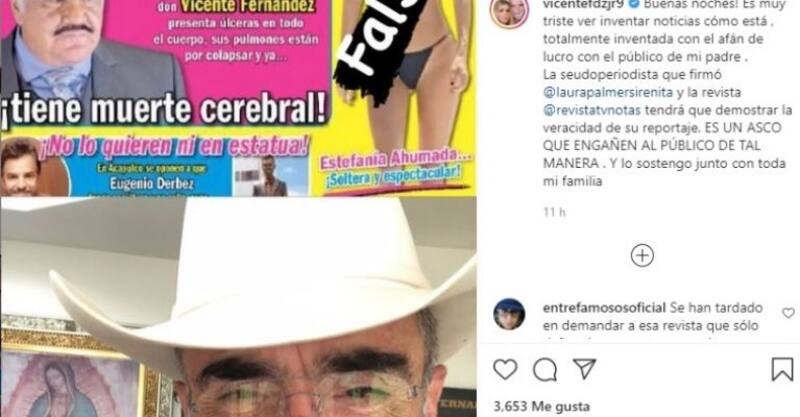 El pasado 11 de octubre Vicente Fernández Jr., utilizó su cuenta de Instagram para desmentir una publicación de TvNotas la cual asegura que su afamado padre, Vicente Fernández tiene muerte cerebral.