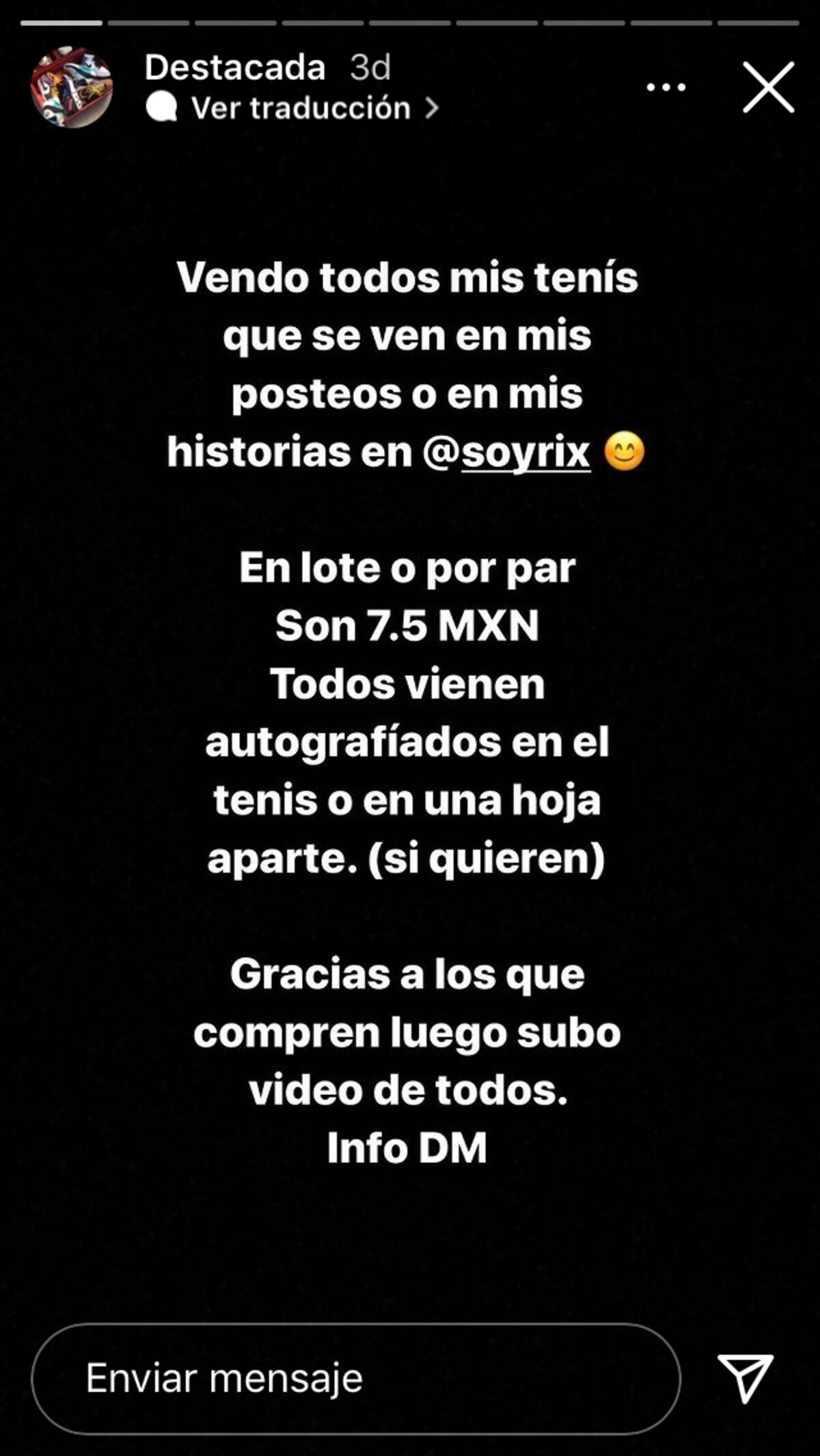 El creador de contenido utiliza la cuenta de Instagram "rixrespaldo" a través de historias destacadas muestra los tenis que tiene en venta. "Vendo todos mis tenis que se ven en mis posteos o en mis historias en @soyrix", escribe. En esta perfil  se pueden apreciar 30 pares de tenis aproximadamente, todos pueden ser enviados a cualquier parte de la República Mexicana y no tienen precio, si alguien desea adquirirlos sólo debe mandar un mensaje con el modelo deseado y lo que ofrece por ellos.