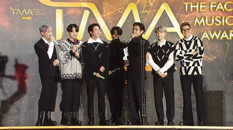 "Muchas gracias por (darnos) el gran premio. Hemos hecho y conseguido mucho este año, como conseguir el número uno en Billboard (Hot 100), presentarnos en los Grammy e ir a las Naciones Unidas, pero no pudimos hacer lo más importante- ver a nuestros fans", comentó RM, el líder del grupo.