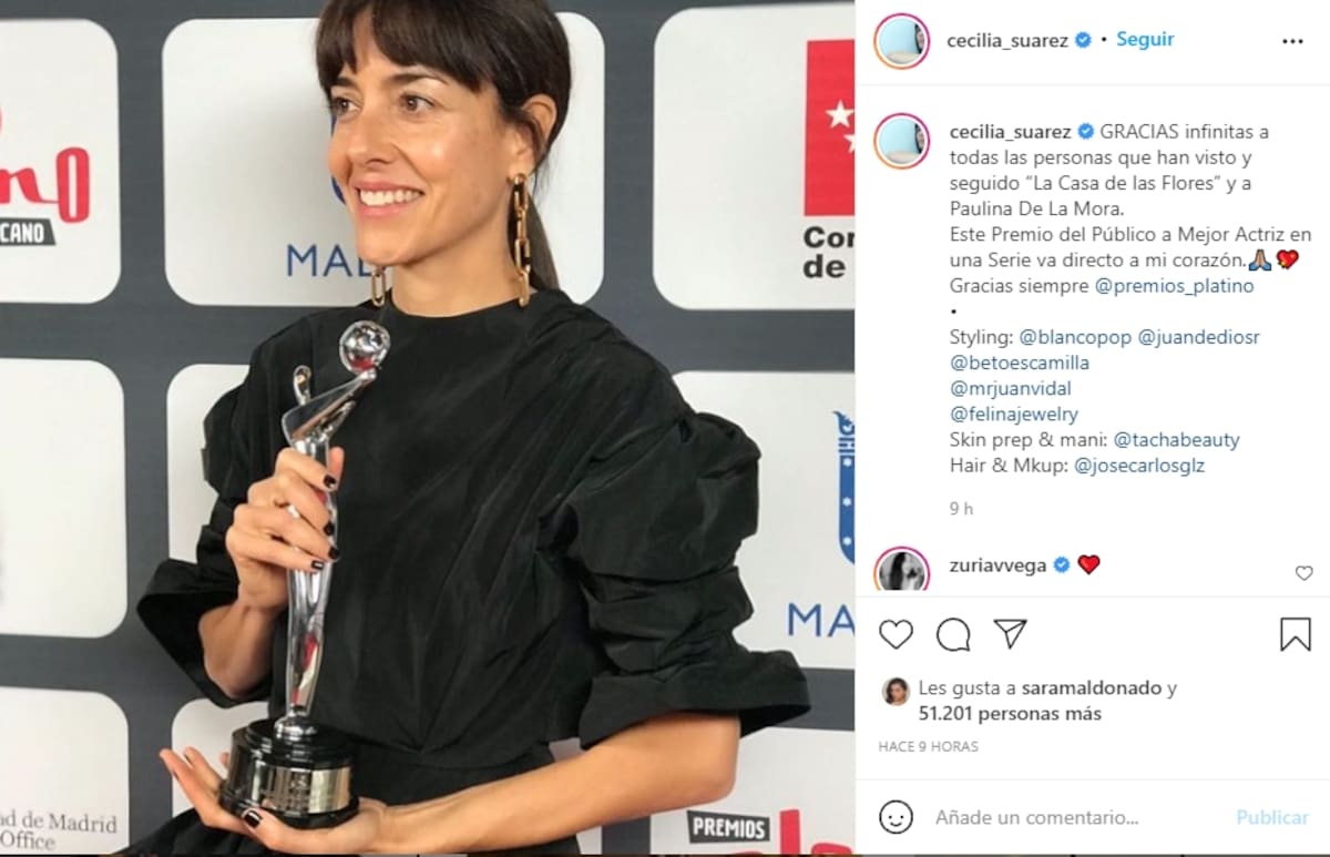 En Instagram, al actriz posó junto a su estatuilla y también subió un pequeño mensaje: "GRACIAS infinitas a todas las personas que han visto y seguido La Casa de las Flores y a Paulina De La Mora. Este Premio del Público a Mejor Actriz en una Serie va directo a mi corazón".