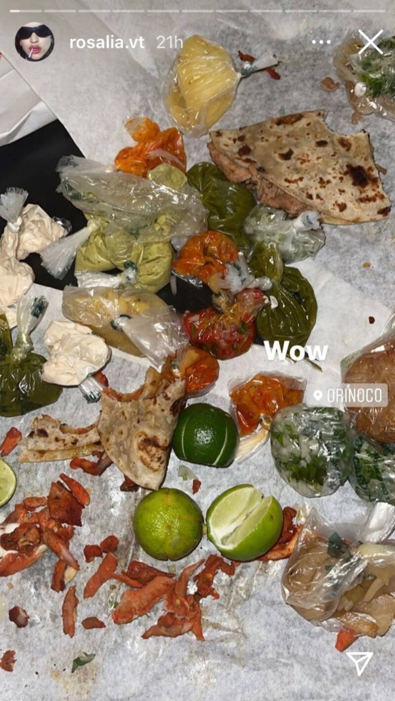La cantante española Rosalía arribó a la Ciudad de México y aunque aún no ha revelado los motivos de su visita, aprovechó su estancia para deleitarse con unos tradicionales tacos. La intérprete compartió mediante historias en Instagram un video donde se pueden apreciar bolsas de salsa, limones, pedazos de tortilla y crema de su pedido de la famosa taquería Orinoco.