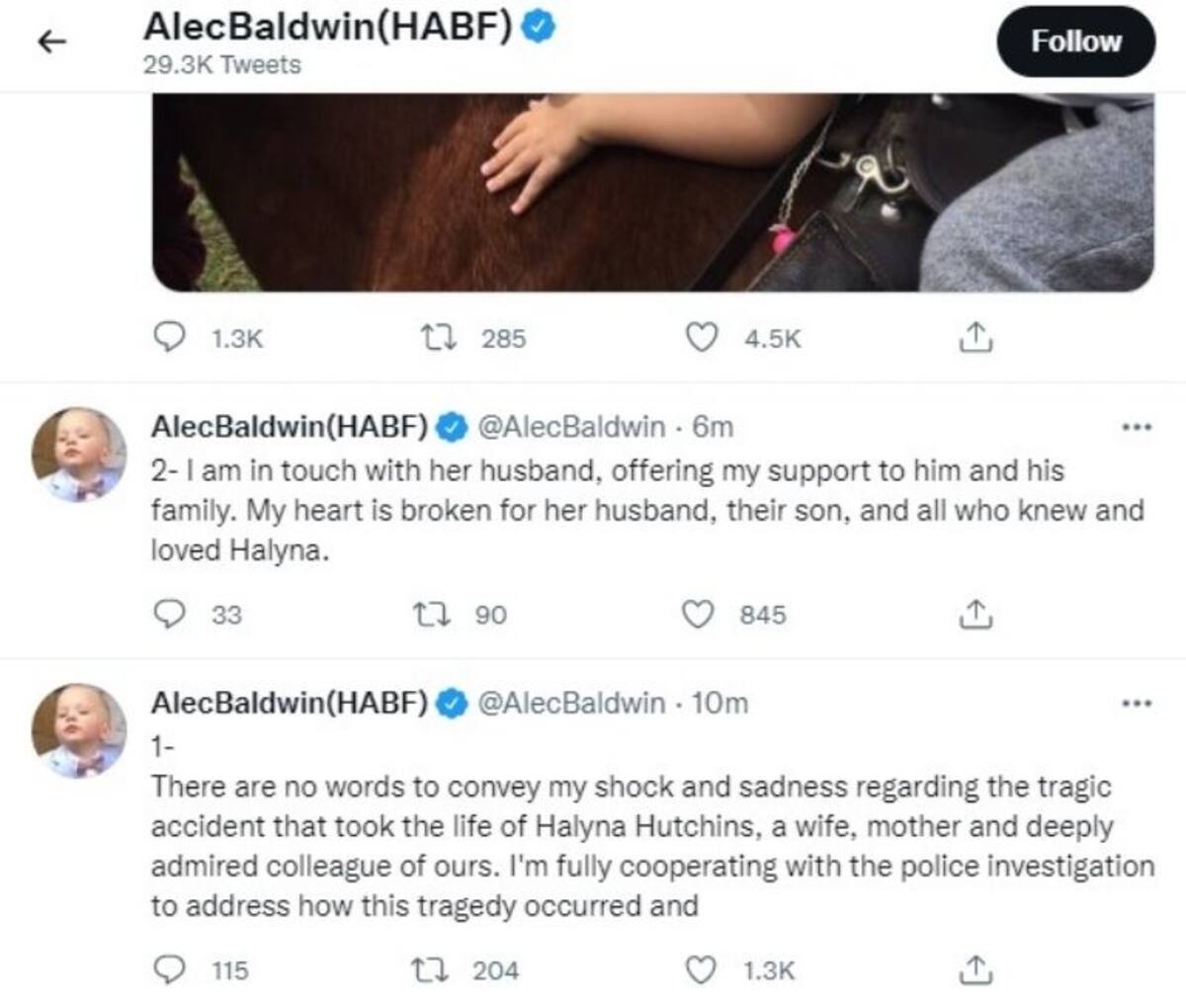 Luego, en un segundo mensaje, Baldwin señaló que "Estoy en contacto con su esposo, ofreciéndole apoyo a él y a su familia. Mi corazón está roto por su esposo, su hijo y todos los que conocieron y amaron a Halyna".