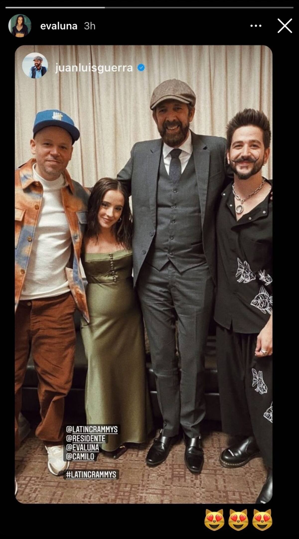 Después de la ceremonia de entrega de los Grammy Latino Evaluna compartió una fotografía en la que aparece junto a René Pérez "Residente", Juan Luis Guerra y Camilo. La imagen volvió a crear curiosidad entre los usuarios pues luce muy pequeña al lado del cantautor domincano.