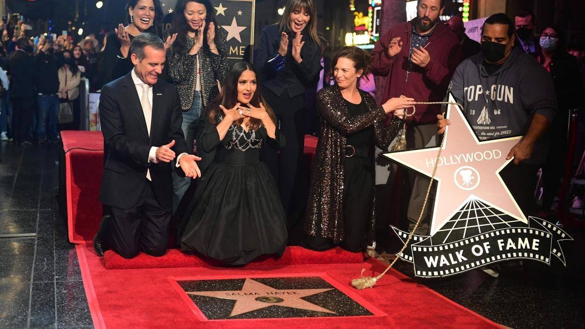 Salma, quien iba con un vestido negro con detalles plateados, llegó acompañada por el actor Adam Sandler, la cineasta Chloé Zhao y el alcalde de Los Ángeles, Eric Garcetti. Descubrió su estrella en el Paseo de la Fama y dijo que con esto lograría sanarse de un episodio violente que vivió en el mismo sector.