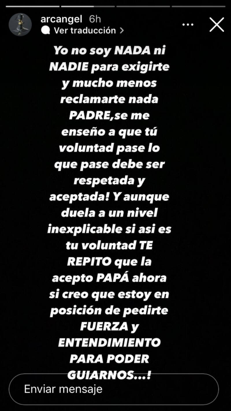 En historias de Instagram, Arcángel escribió un largo mensaje en el que explica que la muerte de su hermano le "duele a un nivel inexplicable", pero que acepta la voluntad de Dios. "Yo no soy nada ni nadie para exigirte y, mucho menos para reclamarte nada, Padre. Si así es tu voluntad te repito que la acepto Papá, ahora sí estoy en posición para pedirte fuera y entendimiento para poder guiarnos", escribió el reguetonero.