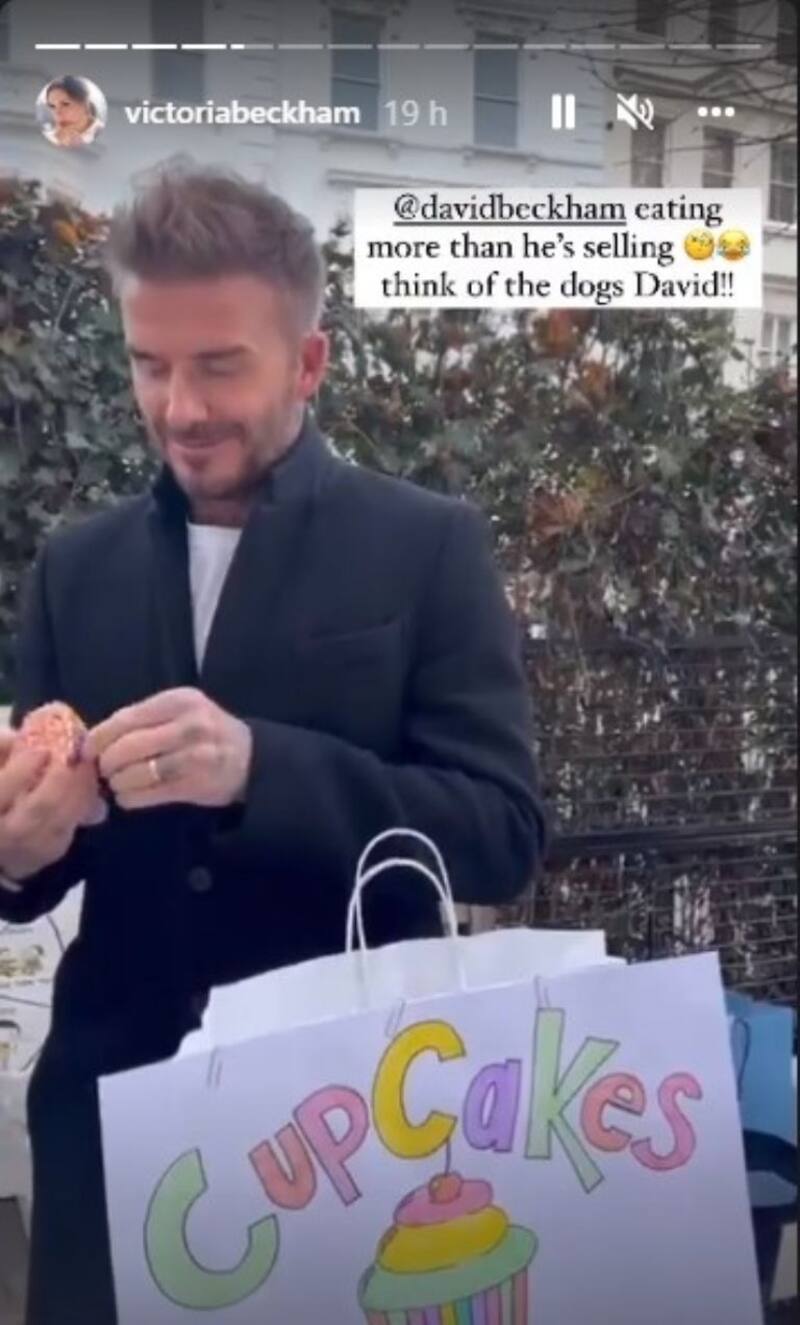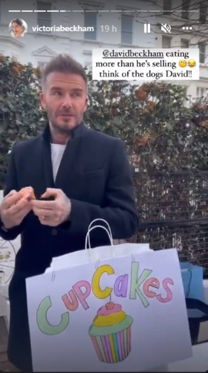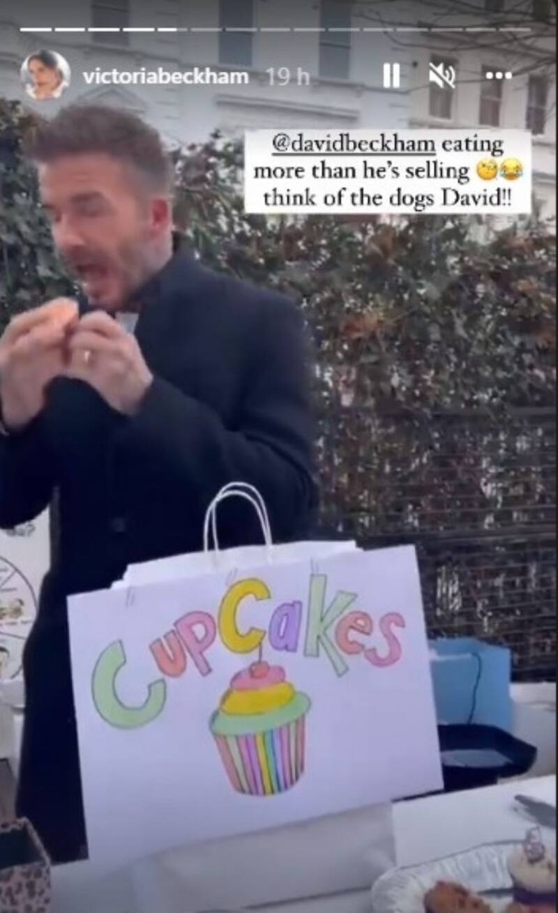 "¡Está comiendo más de lo que vende! Piensa en los perros, David", fue la denuncia de Victoria Beckham quien, a través de una storie en su cuenta de Instagram, publicó el jocoso momento en que el ex futbolista y exitoso empresario comenzaba a sacar el envoltorio de papel para deglutir el pastel.