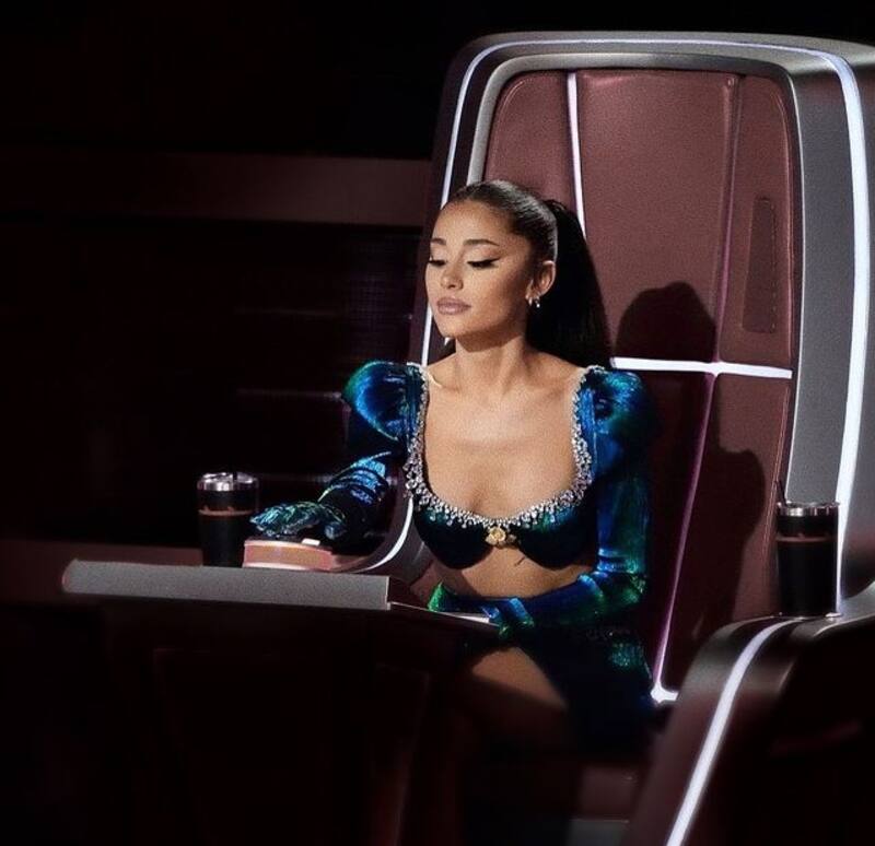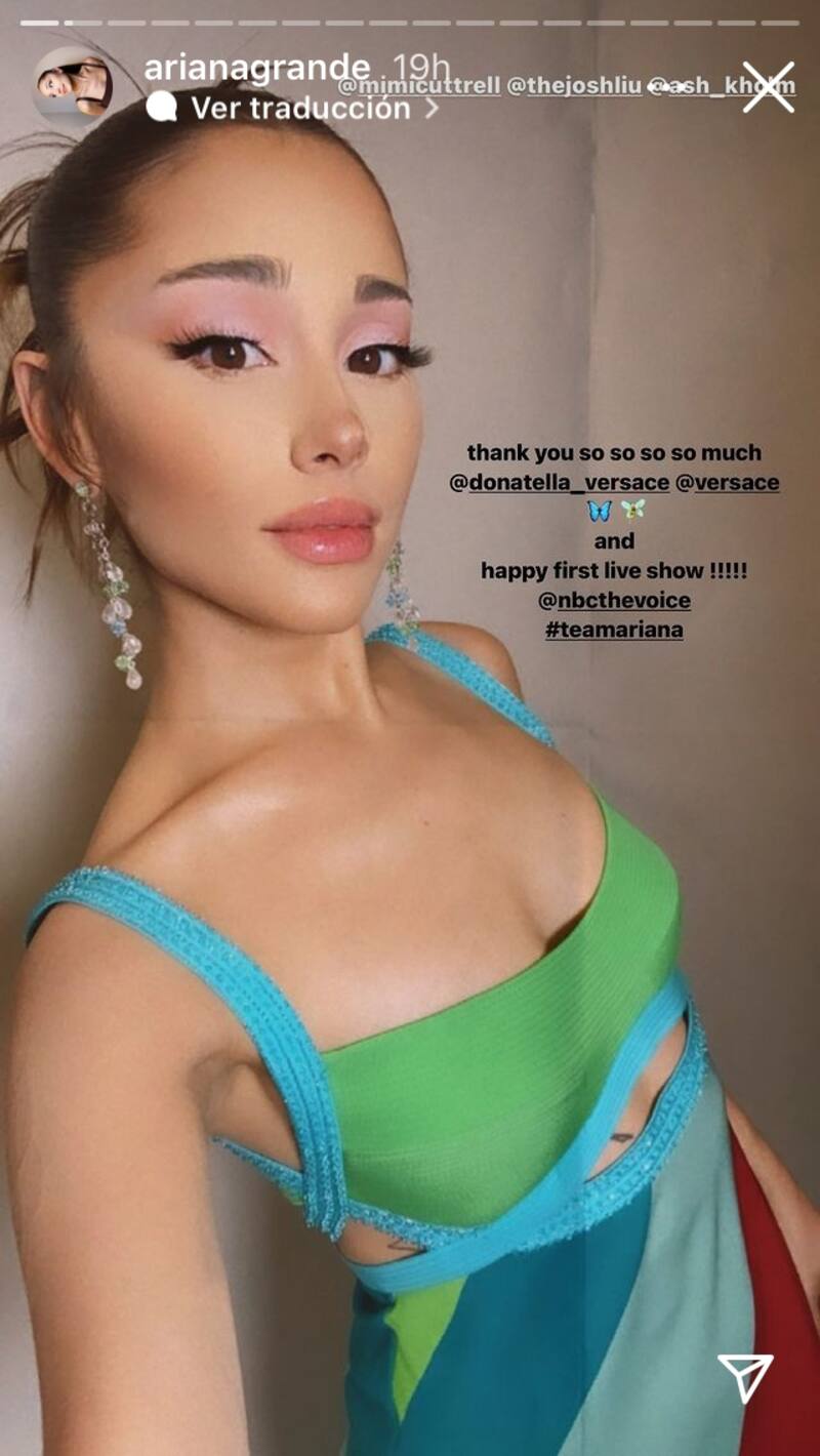 El primer show en vivo de la nueva temporada de The Voice USA se llevó acabo este lunes ahí Ariana Grande subió al escenario junto a Kelly Clarkson, Blake Shelton y John Legend quienes también son couches. La cantante llamó la atención de los presentes ya que llevaba puesto el característico vestido que Jennifer Garner usó en la película Si yo tuviera 30. Aquella prenda de colores llamativos en la que resaltan los diferentes tonos de verde, en esta ocasión la confeccionó especialmente Versace.
