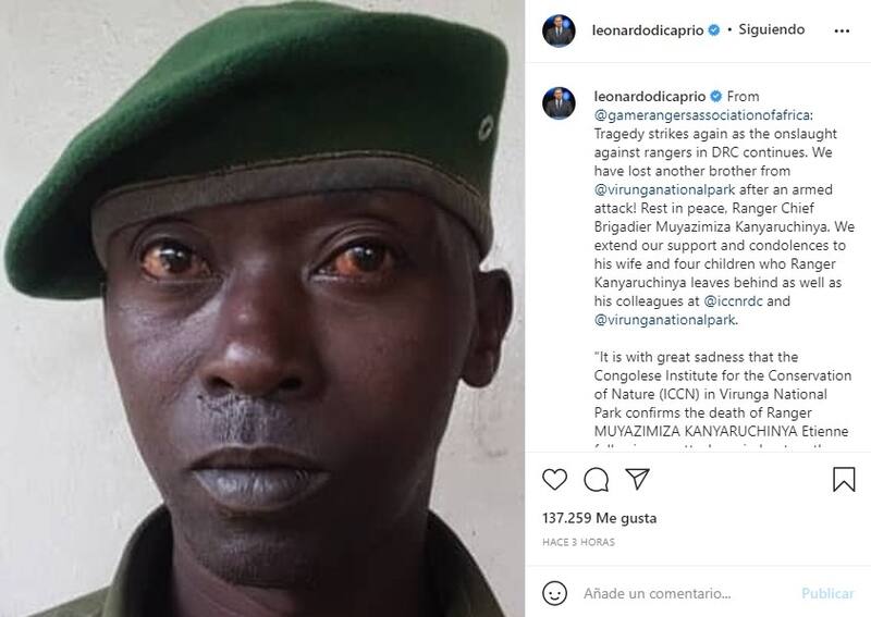 "La tragedia golpea de nuevo mientras continúa el ataque contra los guardabosques en la República Democrática del Congo. ¡Hemos perdido a otro hermano de @virunganationalpark después de un ataque armado! Descanse en paz, jefe de guardabosques, brigadier Muyazimiza Kanyaruchinya. Extendemos nuestro apoyo y condolencias a su esposa y cuatro hijos que el guardabosques Kanyaruchinya deja atrás...", escribió DiCaprio.
