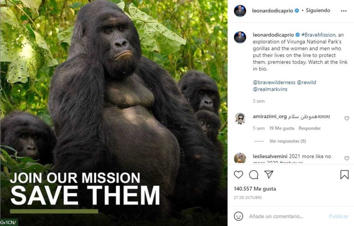 DiCaprio ocupó sus redes sociales para lamentar las circunstancias de la muerte en el parque de conservación, uno de los pocos lugares donde se encuentran los últimos gorilas de montaña que hay en el mundo.