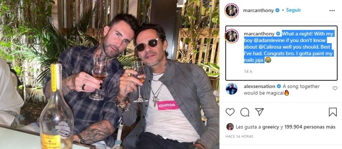 "What a night! With my boy adamlevine if you don't know about Calirosa well you should. Best I've had. Congrats bro. I gotta paint my nails jaja" ("Qué noche! Con mi querido adamlevine; si no conoces bien a Calirosa, deberías. Lo mejor que he probado. Felicidades, hermano. Tengo que pintarme las uñas jaja"), comentó en su cuenta de Instagram el puertorriqueño desde algún lugar de Miami, donde se reunieron con el frontman de Maroon 5.
