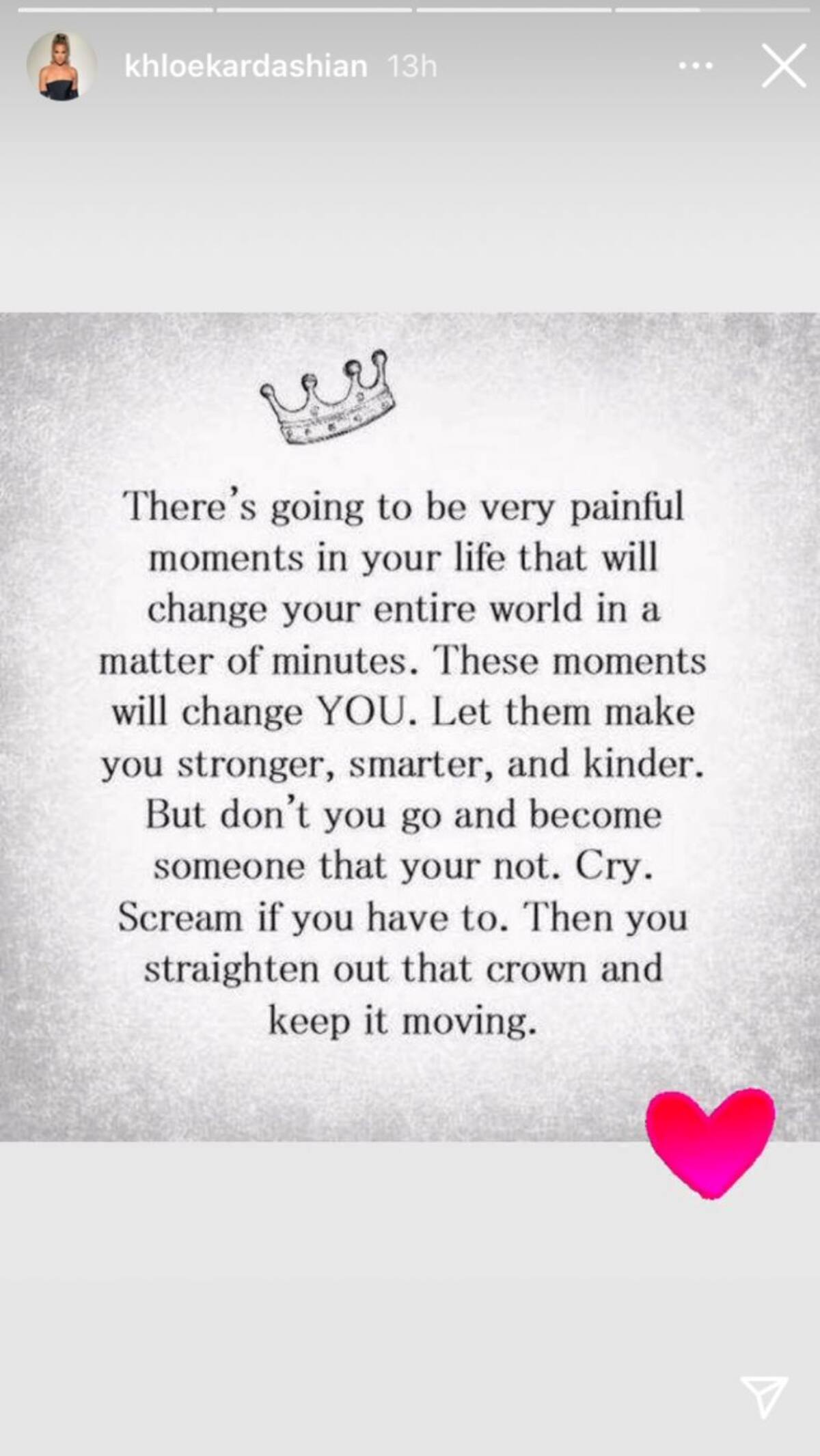 "Habrá momentos muy dolorosos en tu vida que cambiarán todo tu mundo en cuestión de minutos. Estos momentos te cambiarán a TI. Deja que te hagan más fuerte, más inteligente y más amable.