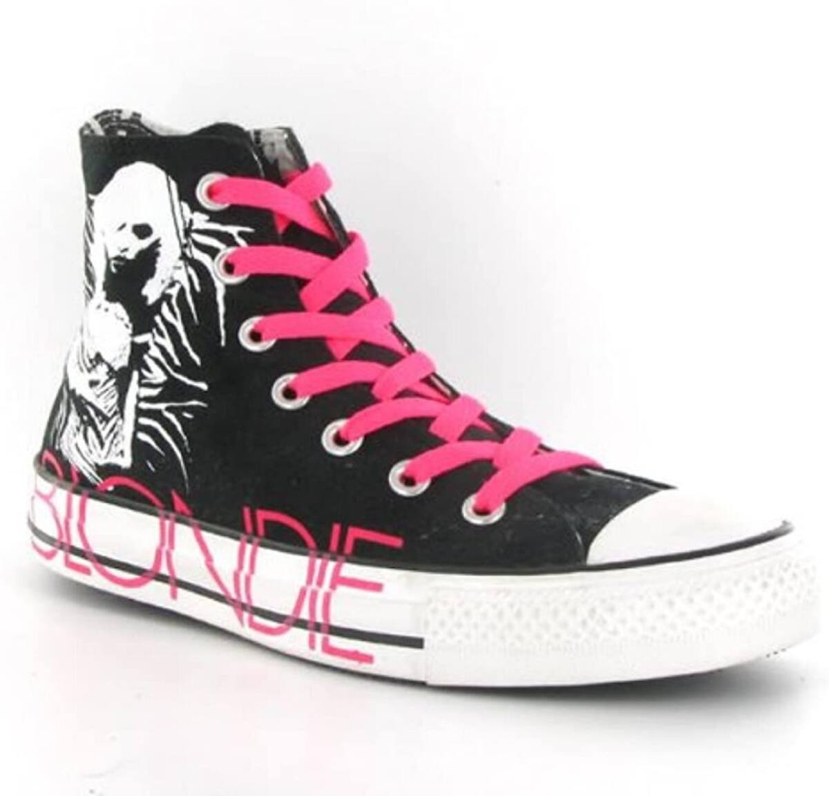 Blondie y Converse también lanzaron una edición especial de los tenis clásicos de Chuck Taylor. En ellos se ve una imagen de la en blanco de la cantante, Debbie Harry y las agujetas en rosa neón.