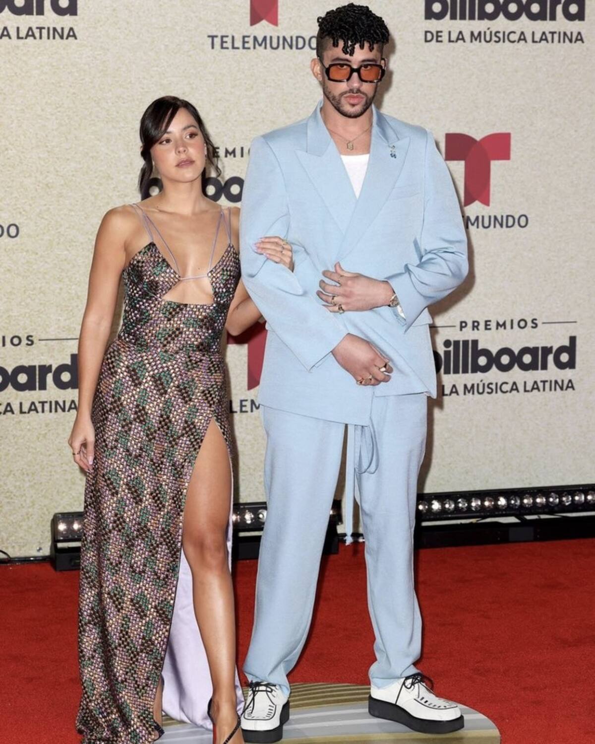 Bad Bunny lució un traje azul claro de dos piezas con una camiseta blanca y grandes lentes con un marco negro, mientras que la puertorriqueña, Gabriela, causó furor entre los presentes y en las redes con un vestido largo multicolor de tirantes y un pronunciado escote.