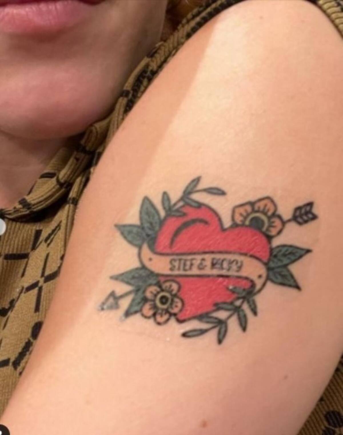 Pero además de las dos fotografías donde se le ve bailando animadamente con su esposo, Camilo, apareció una tercera en la que se observa un tatuaje alusivo a la boda del año, con un corazón y una flecha de cupido, que lleva estampado los nombres de la pareja de recién casados.