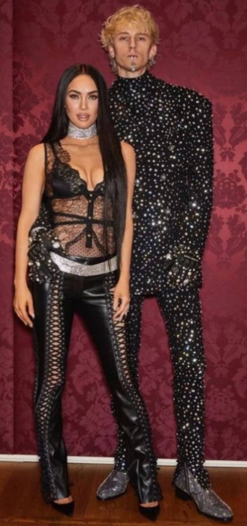 El rockero de "Bloody Valentine", de 31 años, completó el look con botas brillantes, guantes a juego, aretes plateados y múltiples aros en los labios. Fox, de 35 años, se veía glamorosa con un conjunto inspirado en lencería que llevaba un traje de encaje, pantalones de cuero negro con detalles de cordones y un cinturón con incrustaciones de diamantes, a juego con su prometido.