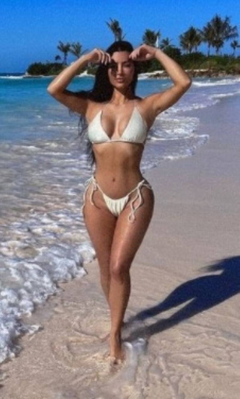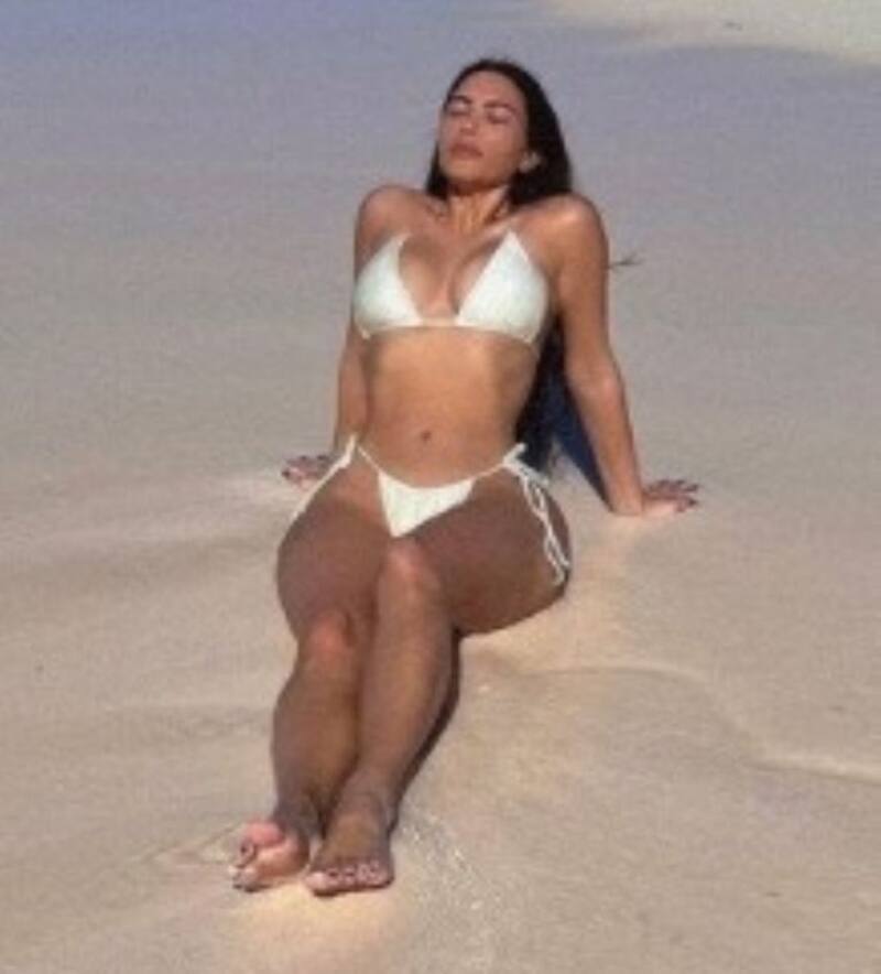 La socialité publicó tres fotos suyas con un diminuto bikini blanco que permiten apreciar su privilegiada anatomía. Son fotos de Bahamas, donde estuvo con su nuevo novio, Pete Davidson.