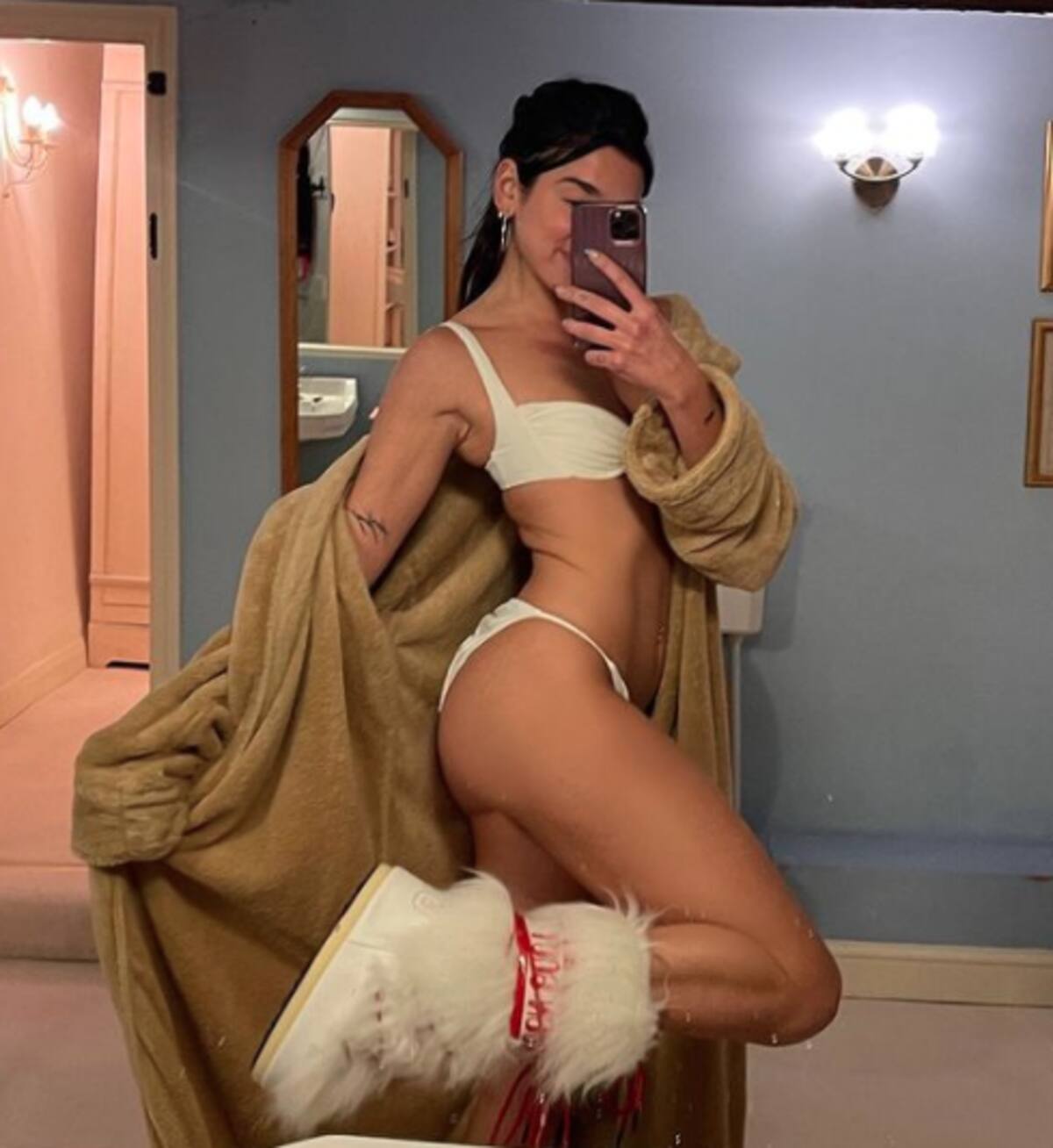 Además de la cena, Dua Lipa y sus amigas tomaron cócteles, se pusieron mascarillas y la cantante se animó a posar afuera de su casa con un bikini y unas botas peludas de Hello Kitty.