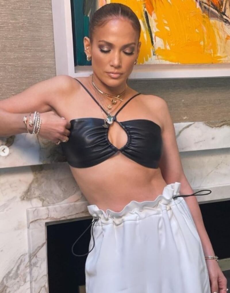Jennifer López publicó en su cuenta de Instagram un par de fotos en donde muestra su trabajado abdomen debajo de un bralette de cuero.