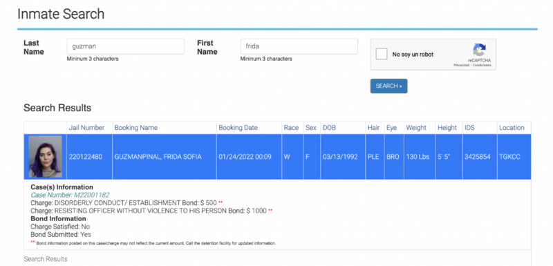 De acuerdo con la Corte Frida Sofía Guzmán Pinal, como se identifica a la joven en el documento, está acusada por alteración del orden público y resistirse con violencia a ser arrestada por la policía.