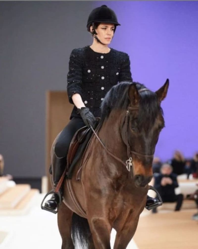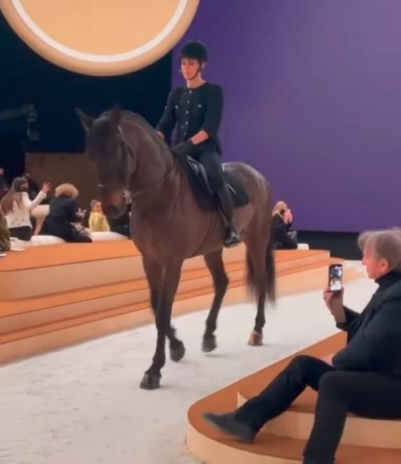 Estaba comenzando la presentación de Chanel, en el Grand Palais Éphémère, durante la Semana de la Moda de París, cuando la reputada amazona y también modelo ingresó por la pasarela montada a caballo y ataviada con un abrigo de pedrería.