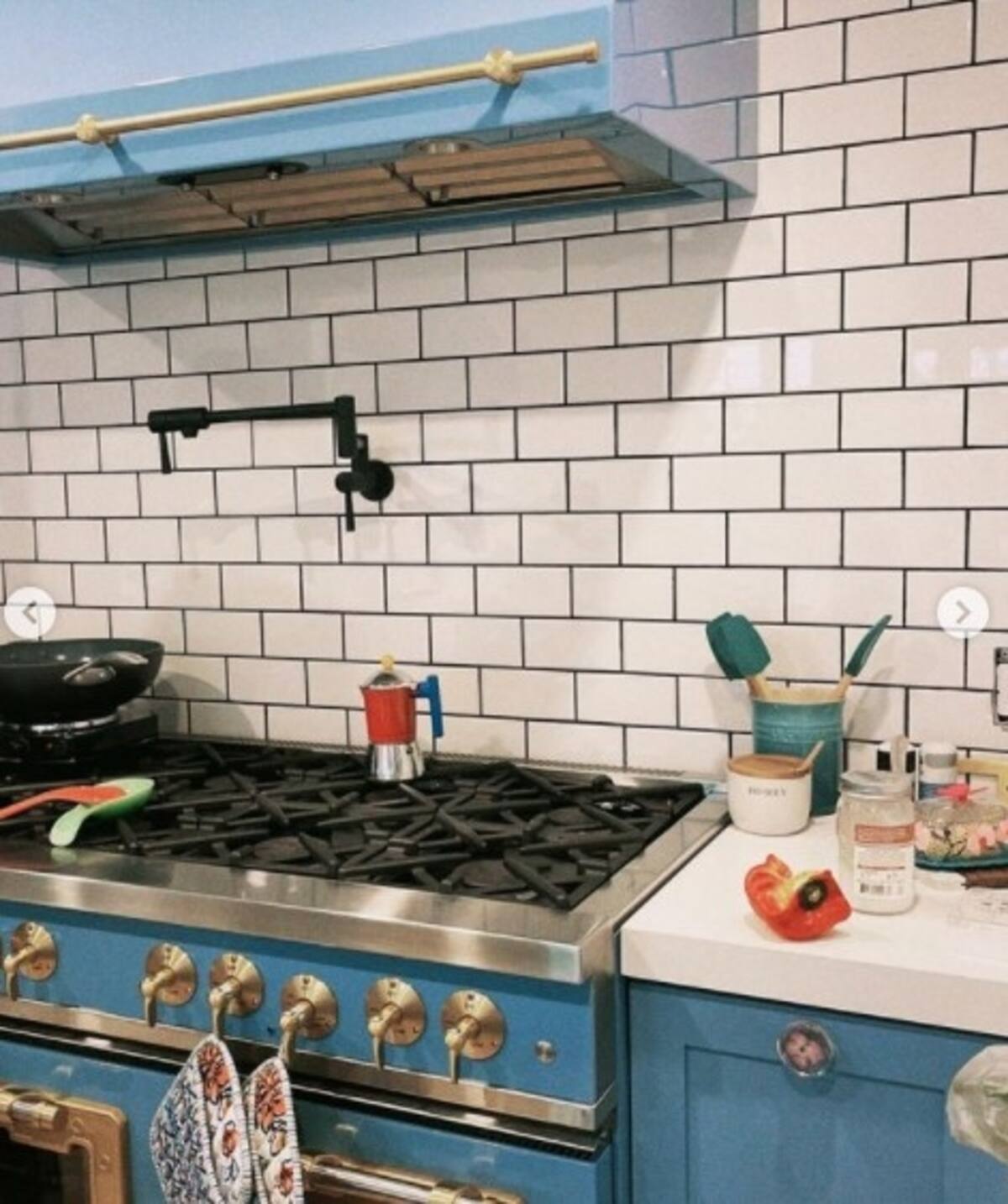 En las siguientes imágenes enseña un poco de su nuevo hogar, como por ejemplo la cocina que tiene paredes de azulejos blancos, mientras la estufa está pintada en tonos azules con detalles en plateado.