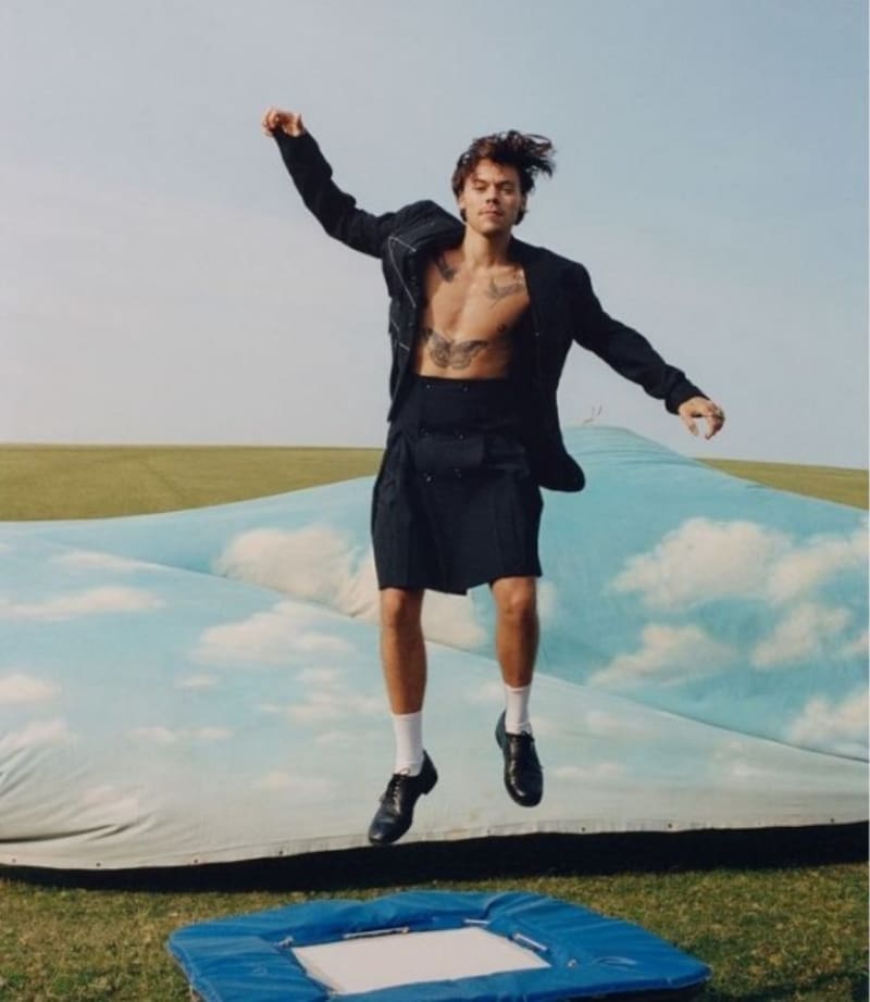 El cantante británico hizo historia al convertirse en el primer hombre en aparecer solo en la portada de la revista Vogue para su edición de diciembre de 2020. Para esa ocasión utilizó varias faldas y vestidos.